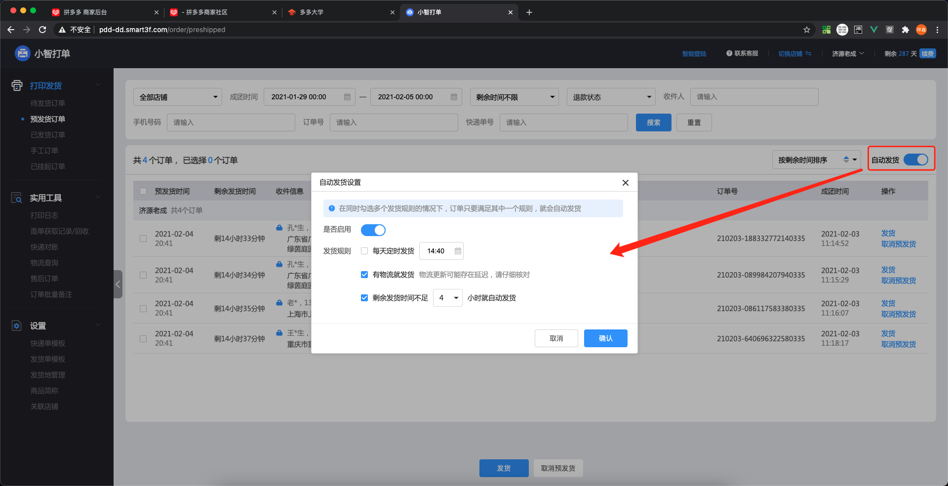 点击左侧列表的“预发货”订单,开启“自动发货”选项,可以自定义设置发货规则。根据店铺情况,这里我们设置了有物流就发货、不足4小时自动发货的条件。